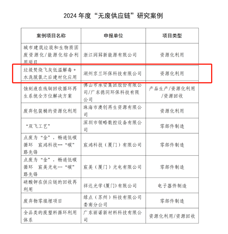 根據(jù)案例研究及匯報情況,本年度評選出10項(xiàng)“無廢供應(yīng)鏈”評價試點(diǎn)及10項(xiàng)“無廢供應(yīng)鏈”研究案例。湖州京蘭環(huán)保科技有限公司憑借 “垃圾焚燒飛灰低溫解毒 + 水洗脫氯之后建材化應(yīng)用” 項(xiàng)目脫穎而出,成功入選 “無廢供應(yīng)鏈” 研究案例。